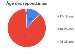 Premier constat : notre échantillon est jeune avec 99% des répondantes qui ont moins de 25 ans. Parmi elles, 12% ont entre 15 et 18 ans et 87% ont entre 18 et 25 ans.