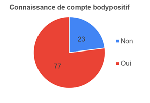Tout d’abord, nous avons constaté que les personnes interrogées sont nombreuses à connaitre des comptes se définissant comme Bodypositif et qu’importe la perception qu’elles ont de leur corps. Seul 23% de notre échantillon n’en connaissent aucun.