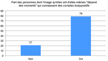 On peut cependant remarquer que les personnes se sentant moins à l’aise avec leur corps sont plus susceptibles de se tourner vers du contenu bodypositif. Ainsi, près de 80% des utilisatrices dont l’image qu’elles ont d’elles-mêmes « dépend des moments » connaissent des comptes bodypositifs.