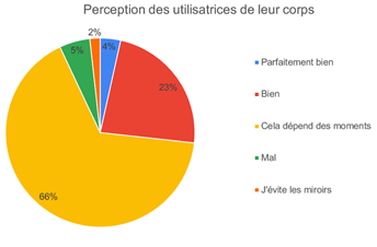 Après cela, nous nous sommes intéressés à la perception général qu’avait les utilisatrices de leur corps. Ainsi nous sommes demandés comment elles se sentaient lorsqu’elles se regardaient dans le miroir.