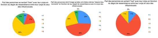 En outre, seulement 17% des personnes se sentant « bien » avec leur corps considèrent que le corps des influenceuses ne ressemble pas au leur contre 48% pour les personnes se sentant moyennement bien avec leur corps et 78% pour les personnes se sentant « mal » avec leur corps.