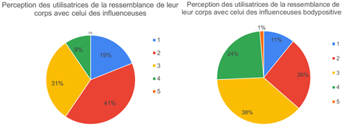utilisatrices, des influenceuses qui ne sont pas bodypositives et, de la perception qu’elle ont des influenceuses podypositives, nous a semblé pertinente. Nous avons alors construit une échelle allant de 1 à 5 pour que les personnes interrogées puissent indiquer le degré de ressemblance de leur corps avec celui des influenceuses (1 signifiant qu’il n’y a pas de ressemblance et 5 signifiant, au contraire, que la ressemblance est très importante).